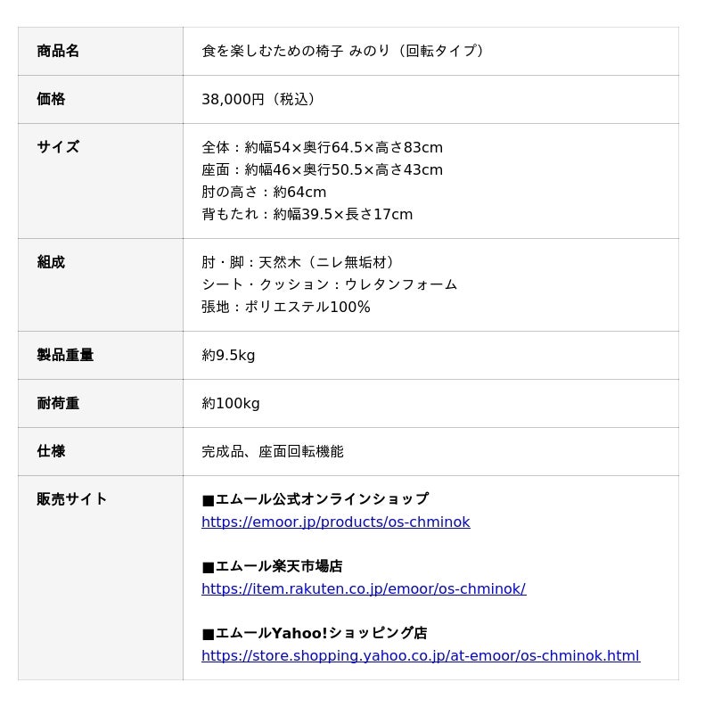 「寝る、座る、たたむ」に専門性を持った健康家具ブランドEMOORを展開する株式会社エムール(東京都立川市:代表取締役 高橋 幸司)は、2026年2月7日より「食を楽しむための椅子~みのり~回転タイプ(以下、みのり回転タイプ)」の先行予約販売(2026年2月中旬入荷予定分)を開始しました。