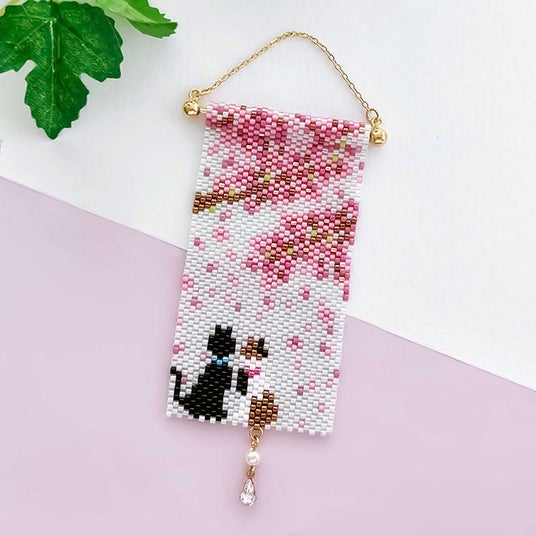 タペストリーキットは、桜を眺めながら寄り添う2匹のねこを描いた、春にぴったりのデザイン。