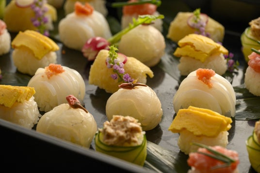 夕食は玄界灘で水揚げされた魚介や九州各地の食材を使った海鮮ビュッフェ。志賀島名物のサザエのつぼ焼きや、新鮮な地魚の姿づくりなど、海辺のリゾートならではの味覚をお楽しみいただけます。また3月からは手まり寿司やカジキマグロと大根のミルフィーユなどの料理も登場します。