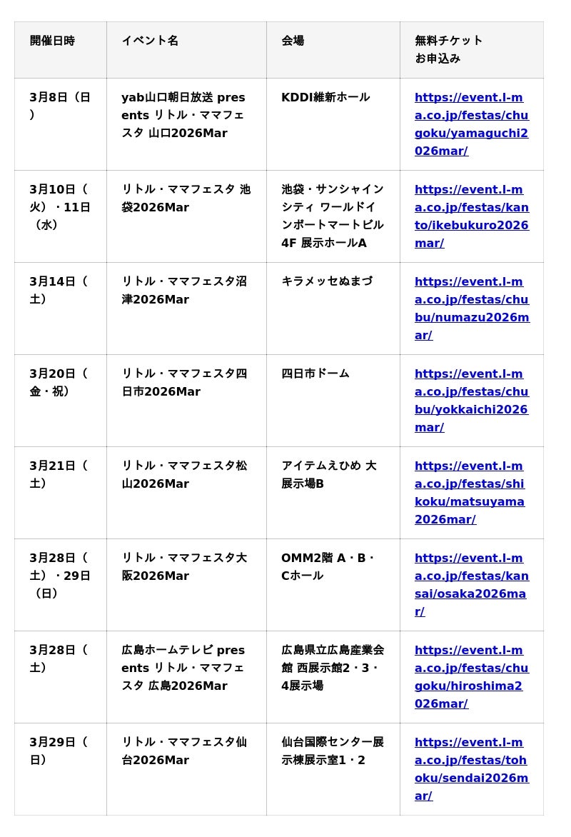国内最大規模の親子フェスタを開催する株式会社エンファム.(東京本社:東京都港区、福岡本社:福岡県福岡市、代表取締役:森 光太郎)は、3月8日(日)山口、3月10日(火)・11日(水)池袋、3月14日(土)沼津、3月20日(金)四日市、3月21日(土)松山、3月28日(土)・29日(日)大阪、3月28日(土)広島、3月29日(日)仙台の8都市にて、親子向けイベント【リトル・ママフェスタ】を開催いたします。ママ・パパとお子さまとの『思い出づくりの場』として、ご家族皆様でお楽しみください。