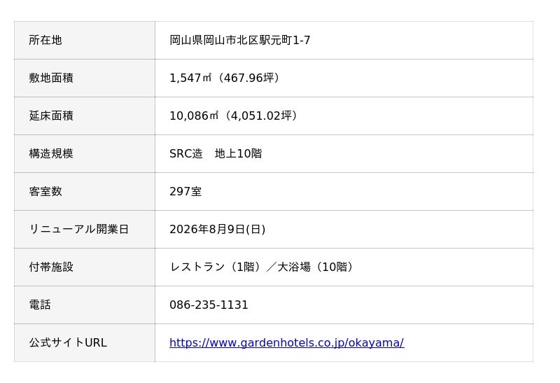 三井不動産株式会社(本社:東京都中央区、代表取締役社長:植田 俊)および株式会社三井不動産ホテルマネジメント(本社:東京都中央区、代表取締役社長:杉山 亮)は、「三井ガーデンホテル岡山」(所在:岡山県岡山市)のリニューアル工事を実施しておりますが、2026年8月9日(日)にリニューアルオープンすることを決定しました。宿泊予約の受付は、2026年2月9日(月)より開始いたします。