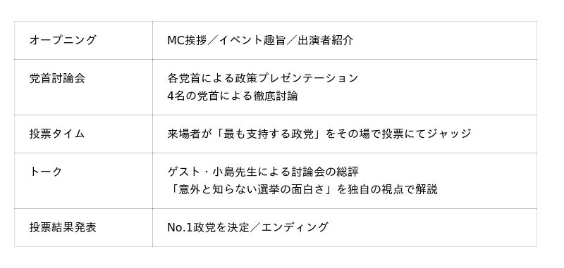 本イベントでは、様々な分野で活躍する4組のタレントが、「オリジナル政党の党首」として、日本を明るくするための政策について議論を行います。討論会終了後、来場者には実際の選挙に使用する投票用紙、投票箱を用い「最も素晴らしいアイデア」だと思った政党に投票していただきます。楽しみながら行う投票体験を通じ、選挙の重要性を周知し、自発的な投票行動に繋げて