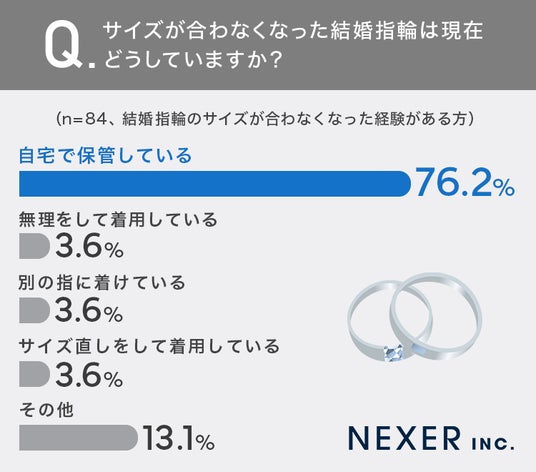 その結果、76.2%が「自宅で保管している」と回答し、もっとも多い結果となりました。一方で「無理をして着用している」「別の指に着けている」「サイズ直しをして着用している」は、いずれも3.6%にとどまっています。