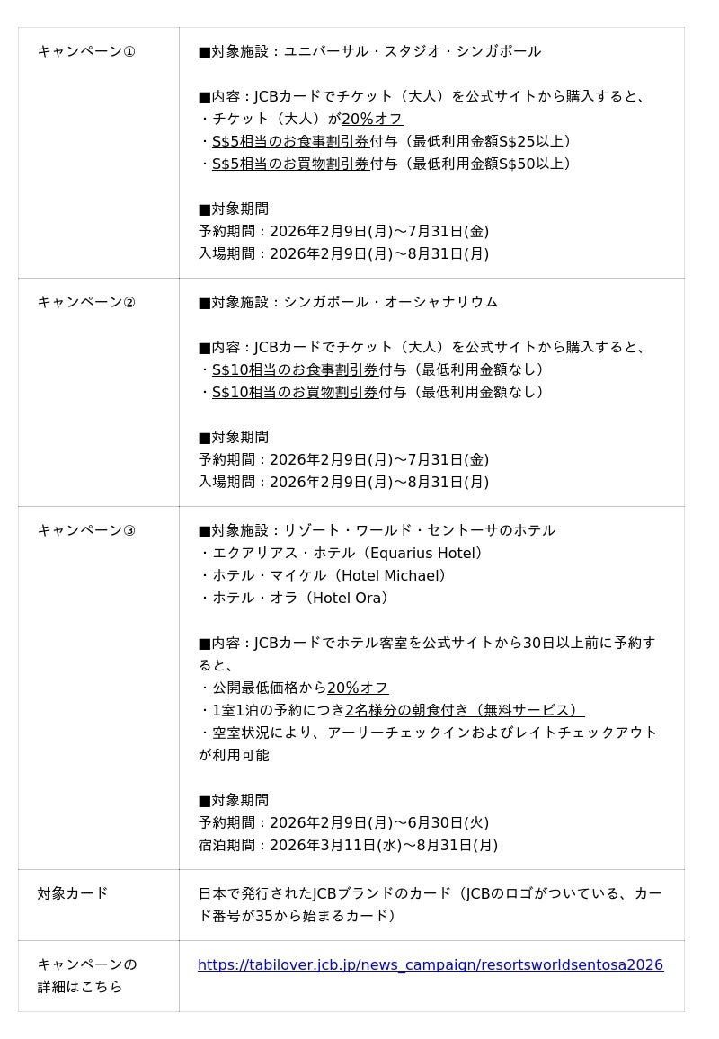 日本発唯一の国際カードブランド運営会社である株式会社ジェーシービーの海外業務を行う子会社、株式会社ジェーシービー・インターナショナル(以下、総称してJCB)は、ユニバーサル・スタジオ・シンガポールなどを運営するRESORTS WORLD AT SENTOSA PTE.LTD.(以下、リゾート・ワールド・セントーサ)と、2026年2月9日(月)より共同キャンペーンを実施します。