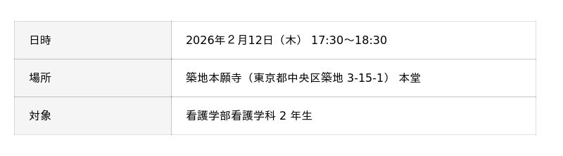 武蔵野大学看護学部看護学科(東京都江東区、学長:小西 聖子)は2月12日(木)に本学発祥の地である「築地本願寺」で「発願式」を開催します。当日は臨地実習前の学生約143名が気持ちを新たに看護への志を誓います。