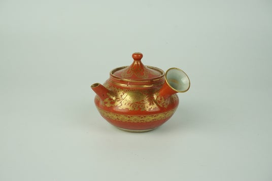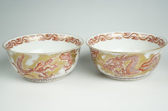 九谷焼の草創期「古九谷」の時代から使われている「九谷五彩」。この伝統色ともいうべき5色の内、赤だけが他の4色とは違う性質を持ちます。他の4色(黄、緑、紫、紺青)が厚く盛り上げて塗ることで強い色を発色させるのに対し、赤は他の色とは原料の組成が異なるため、盛り上げる必要がないので、運筆の勢いを生かしたり、比較的細かい描写に向いていることは、先人たちも早くから気づいていました。しかし、その特性が最大限に引き出され、九谷焼の伝統様式の一つ「赤絵細描」として高められるには、「古九谷」廃絶から更に百数十年後、「再興九谷・吉田屋窯」の窯元を受け継いだ「宮本屋窯」の陶画工、「飯田屋八郎右衛門」の登場を待たなければなりませんでした。