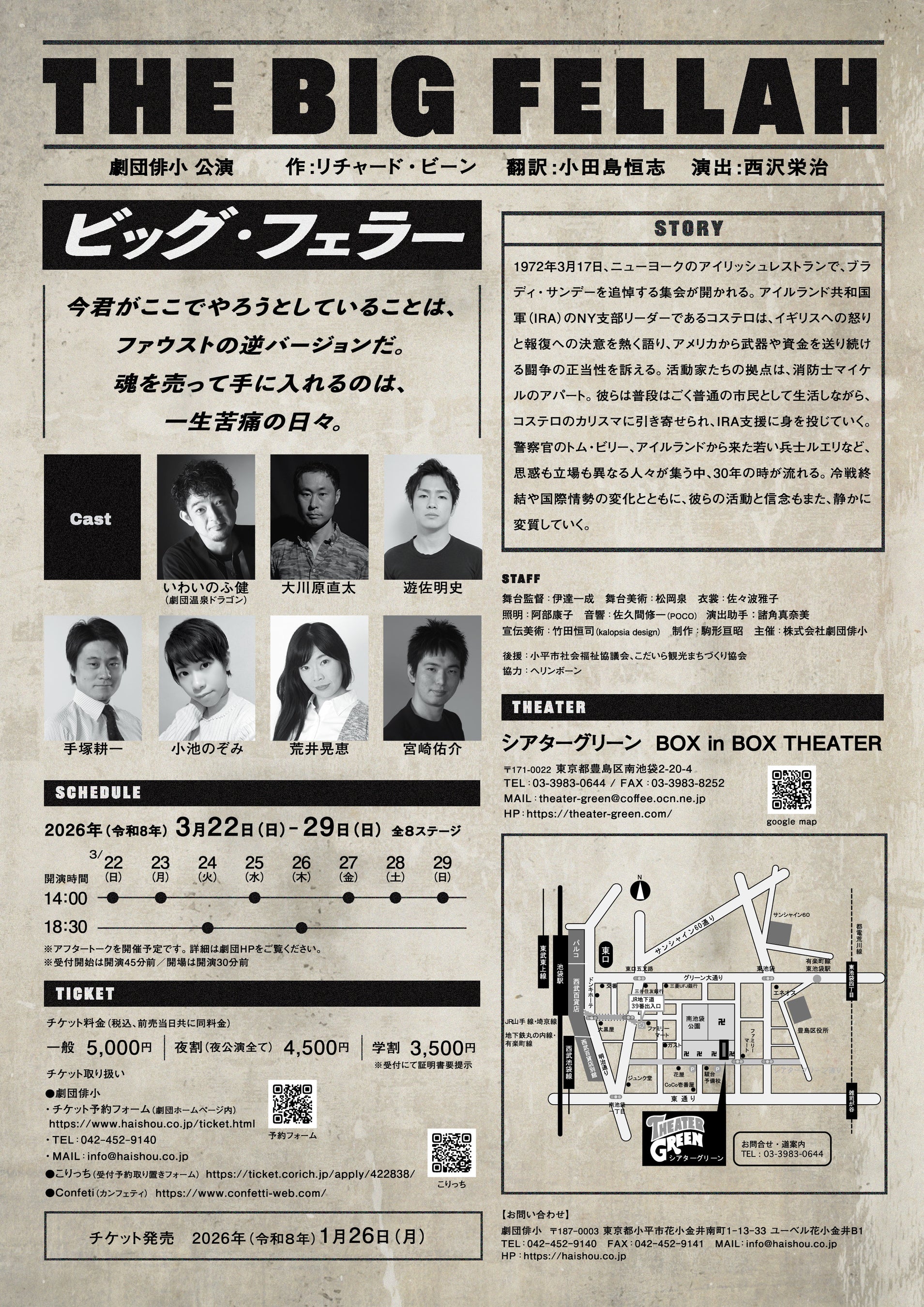 この度、劇団俳小は3月22日(日)~29日(日)に【池袋】シアターグリーン BOX in BOX THEATERにて、祖国の自由と解放を願うアイルランド共和国軍(IRA)の活動家たちの挫折と衰退を描くリチャード・ビーン作「ビッグ・フェラー」を上演致します。