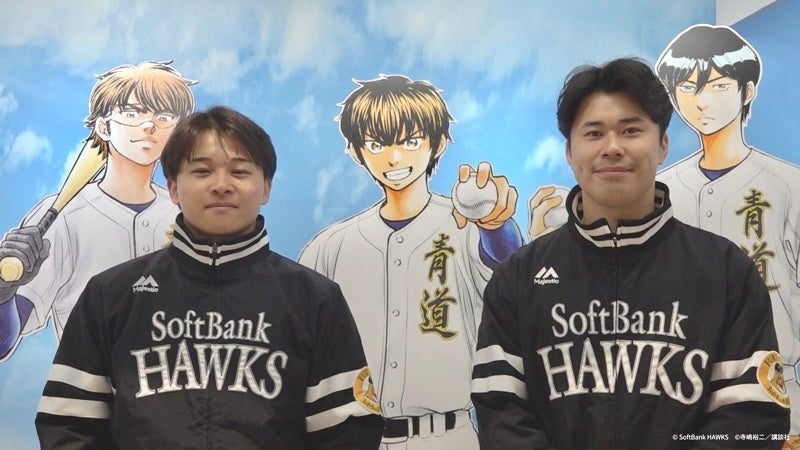 BOSS E・ZO FUKUOKA 6F イベントホールで開催中の「大『ダイヤのA actII』原画展」福岡展に福岡ソフトバンクホークスの松本晴投手・谷川原選手が来場しました!両選手が学生時代に親しんでいた同作品を懐かしく振り返りながら、展示された数々の原画を一つひとつ丁寧に鑑賞し、原画展を存分に楽しんでいました!