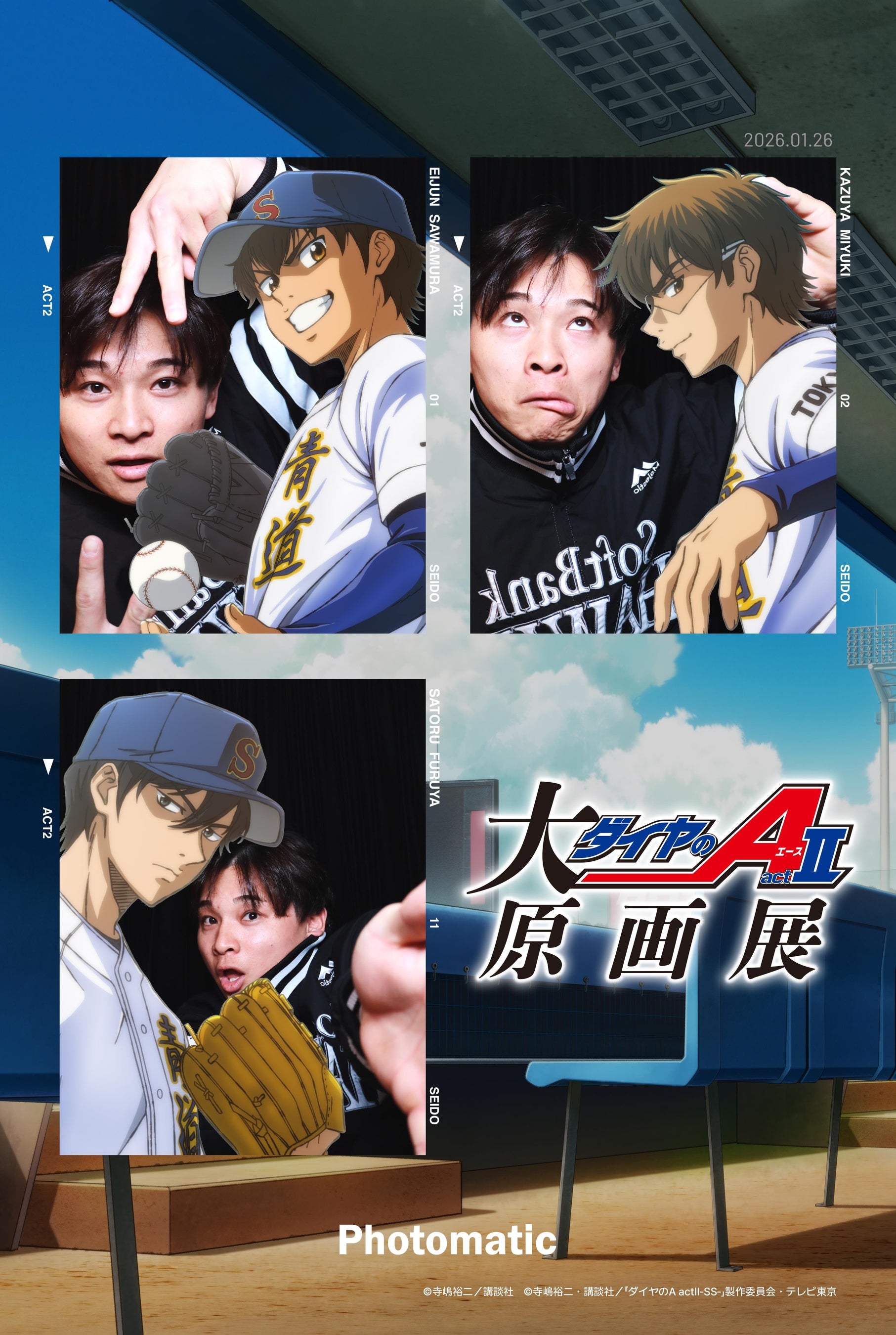 『ダイヤのA』シリーズのメインキャラクターである沢村栄純、御幸一也、降谷暁と一緒に写真に収まることができる「ツーショット風」のデザイン。松本晴投手・谷川原選手にはそれぞれ思い思いのポーズで撮影していただきました!コラボフレームは4月18日(土)まで販売中。ぜひ思い出の1枚をお持ち帰りください!
