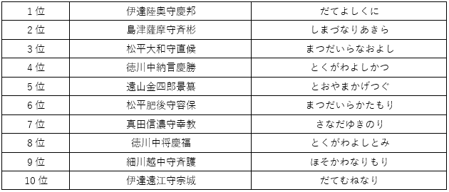 例年人気のツートップ、伊達と島津という江戸時代の有力大名や、幕末の歴史を動かした松平容保公の人気は健在でしたが、2025年に限っては徳川慶勝公、慶福公の名が急浮上。川越藩主の松平直候公も上位に復帰。また、名奉行「遠山の金さん」こと景元公の嫡男である遠山景纂公も5位に入るなど、「江戸」の将軍家に近い人物や、「江戸」の町そのものにゆかりの深い人物が上位に並んだのが特徴的でした。特に徳川の名前が上位に、それも複数並ぶのは異例中の異例のことです。