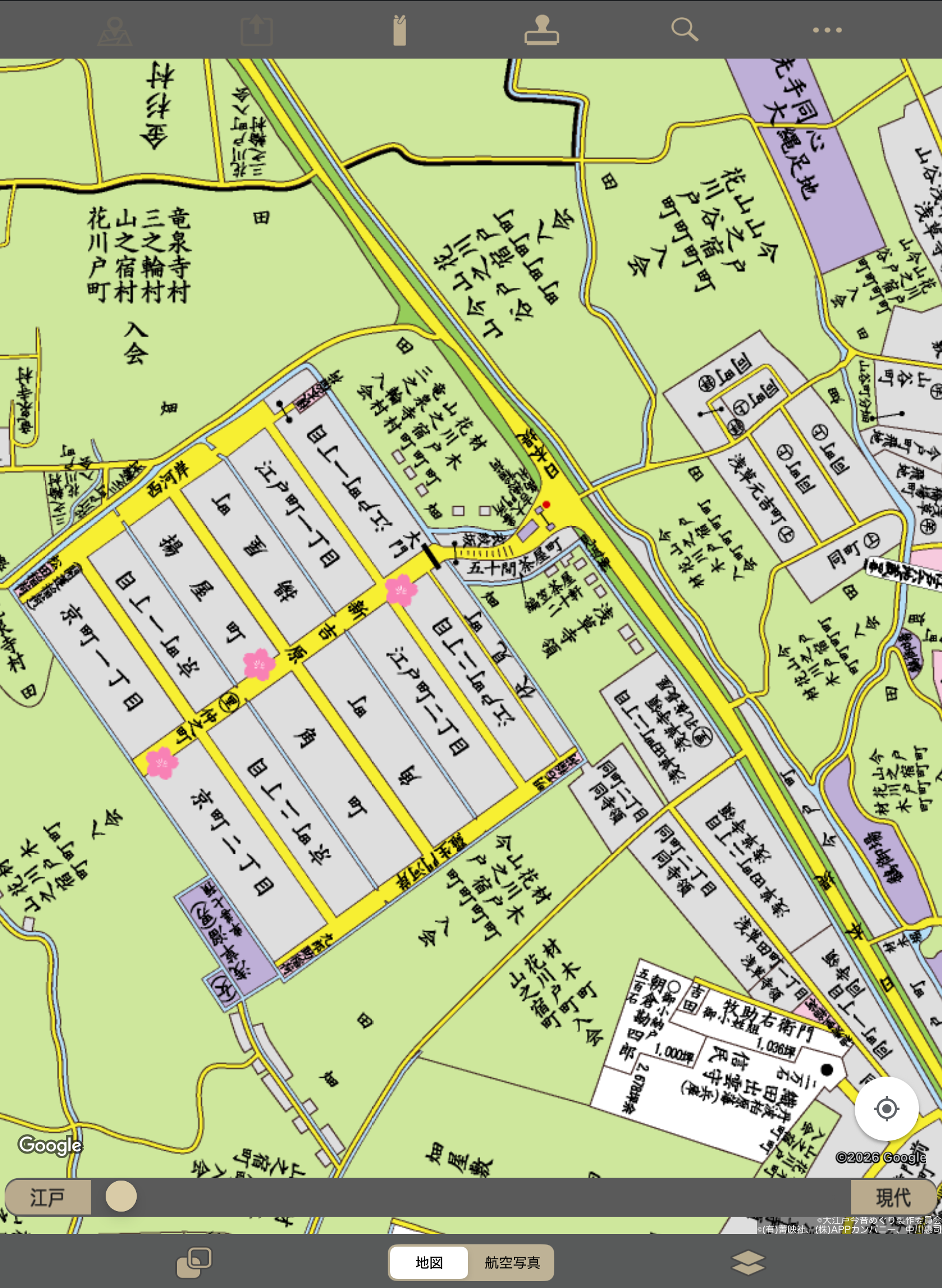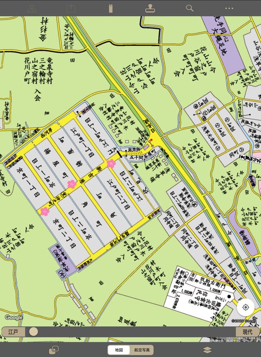 当アプリの古地図画面(伊達家上屋敷付近)