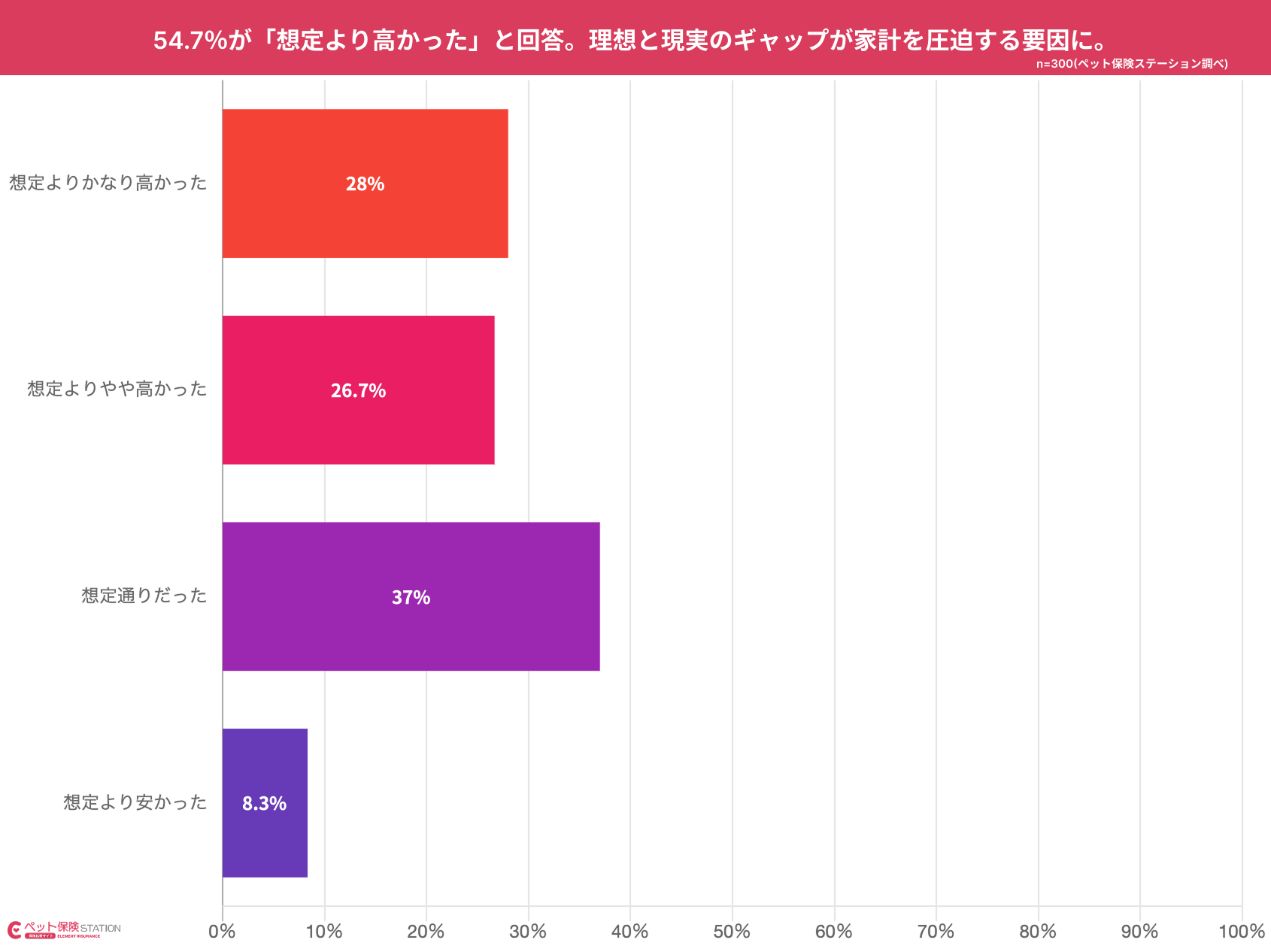 「想定通り(37%)」を大きく上回り、半数以上の飼い主が事前の見積もり不足を感じている現状が判明しました。