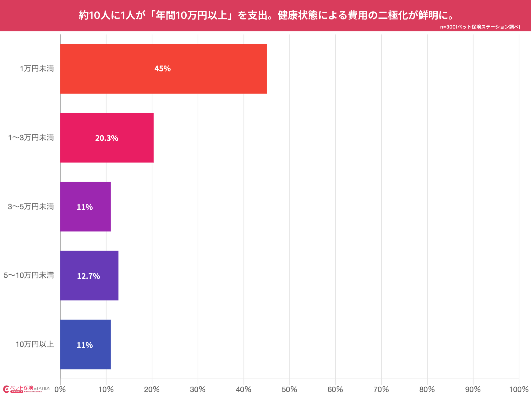 一方で、年間「10万円以上」かかった層も11%存在しており、ペットの健康状態等によって費用負担に幅がある実態が示されました。