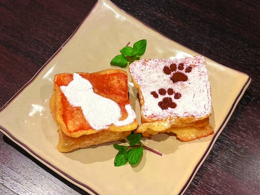 通年販売しているフレンチトーストに猫の日フェア限定で粉糖やココアパウダーを使用して、可愛らしくネコ仕様にしました。