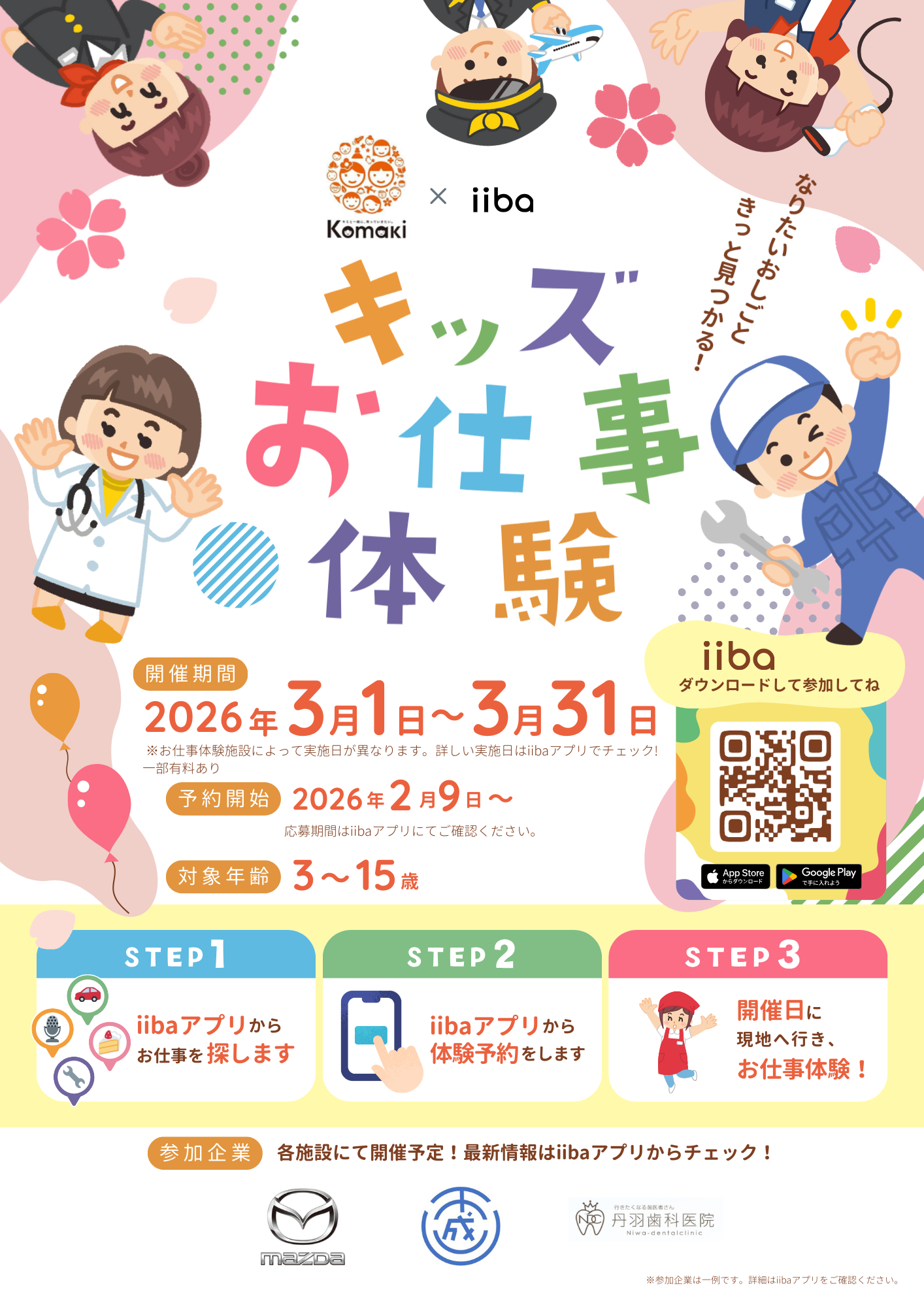 子育てマップアプリ『iiba』を運営する株式会社iiba(本社:東京都港区、代表取締役:逢澤奈菜、以下 当社)は、愛知県小牧市と連携し、市内のお仕事を体験できる「キッズお仕事体験イベント」を2026年3月1日(日)~3月31日(火)に開催いたします。