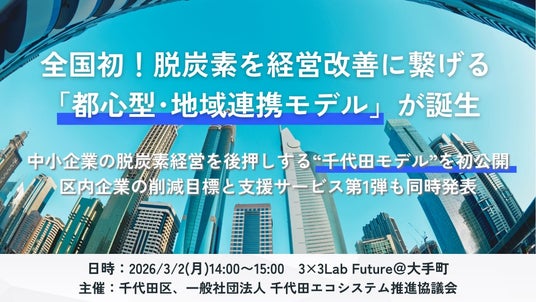 千代田区は、全国初となる「都心型・地域連携モデル(千代田モデル)」の発足を宣言します。2025年度に実施した「ちよエコ未来企業スクール」参加企業によるCO2削減目標の公開に加え、「中小企業向けの脱炭素支援サービス・製品」第1弾を2026年3月2日(月)14時から発表いたします。