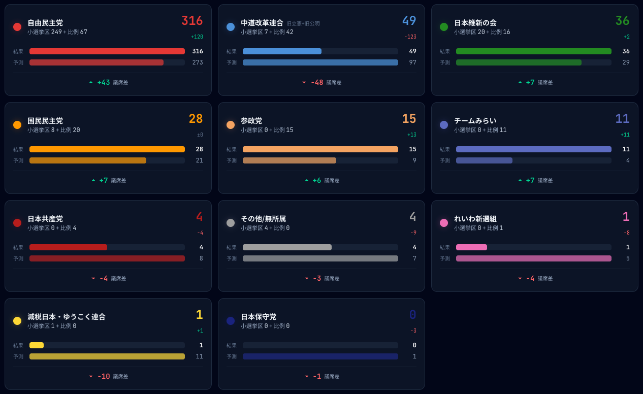 自民が予想より+43議席、中道が予想より-48議席と想定外に