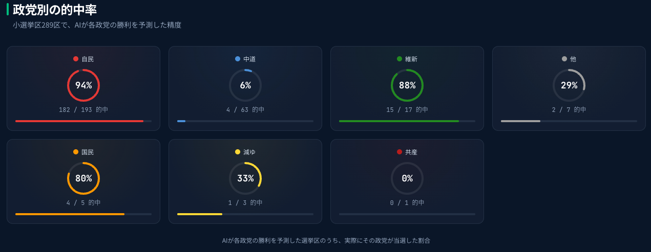 AIによる分析と予想でしたが、最終的には大手メディアを変わらない予想となった一方で、自民党の躍進については想定以上、中道の衰退も想定以上と、なりました。