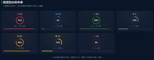 ホリエモンAI学校株式会社(本社:東京都新宿区、代表取締役CEO:荒木 賢二郎、以下「ホリエモンAI学校」)は、2026年に実施された衆議院議員総選挙に向けて公開したAI選挙予想サービス『ホリエモンAI選挙』の予想的中結果を発表いたしました。