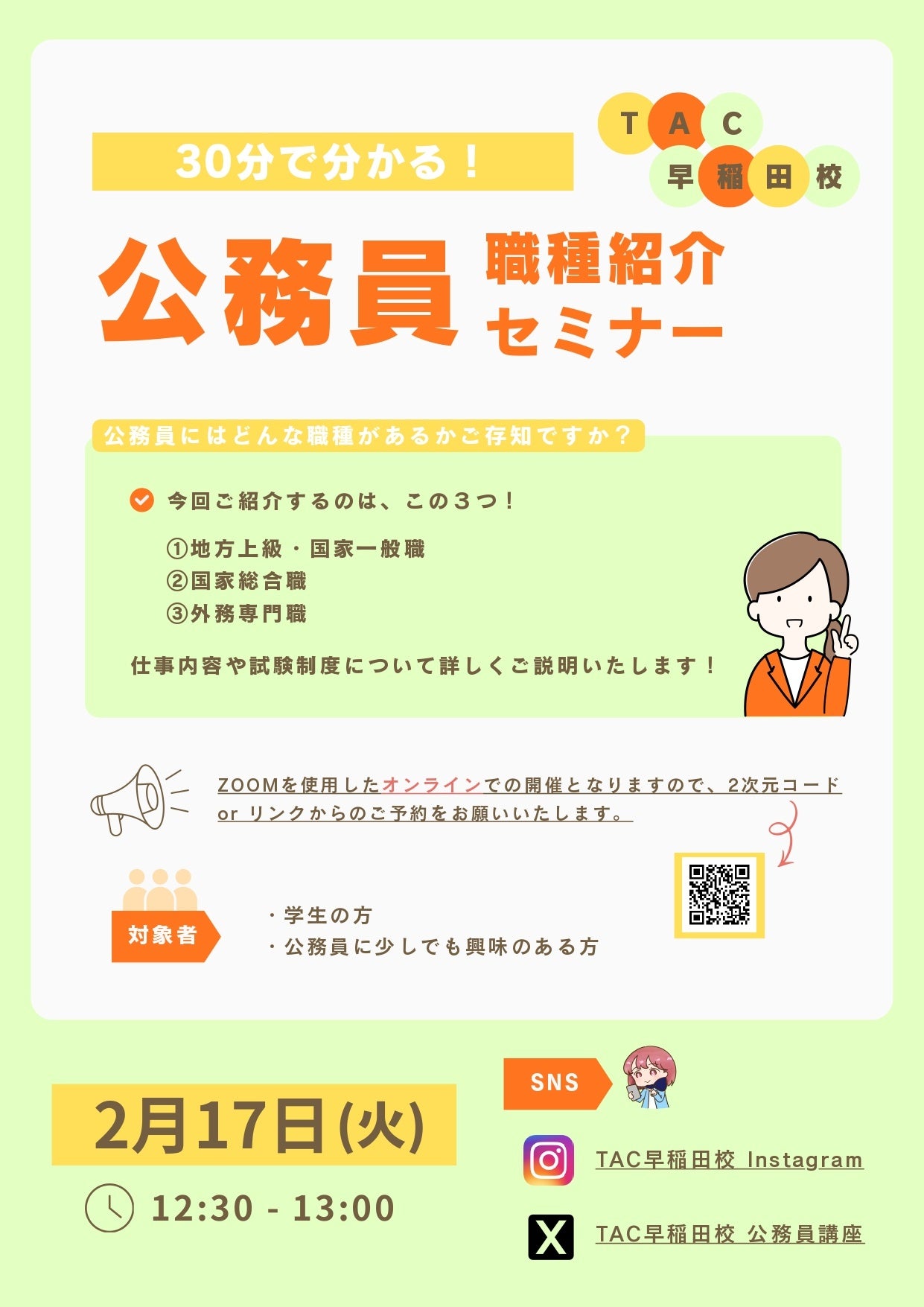 TAC早稲田校では、1.地方上級・国家一般職、2.国家総合職、3.外務専門職の3つの講座を開講しております。今回のセミナーではそれら3つの講座について、試験制度や仕事内容をご説明します。セミナーに参加するにあたり、ご不明な点などございましたらお気軽にお問合せ下さい!