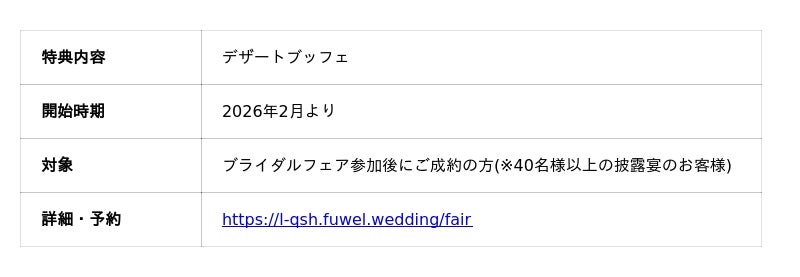 静岡県浜松市でブライダル事業を展開する株式会社スティルアン(本社:静岡県浜松市中央区田町326-30、代表取締役社長:大石 奉樹)が運営する「キャトルセゾン浜松」は、2026年2月より、ブライダルフェア参加後にご成約いただいた方への特典として、披露宴で好評の「デザートブッフェ」の提供を開始いたしました。