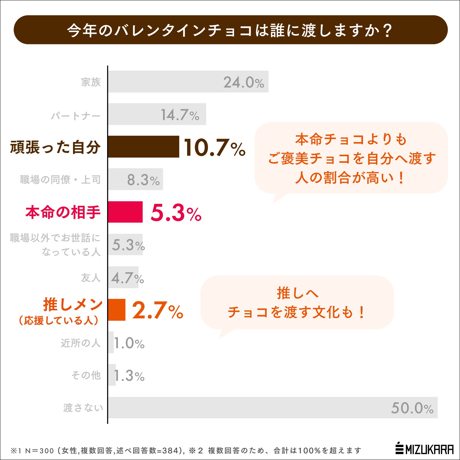 調査の結果、ちょうど半数(50.0%)がバレンタインチョコは渡さないと回答。また、渡す相手で多かったのは家族(24.0%)やパートナー(14.7%)でした。3位に入ったのが「頑張った自分(10.7%)」で、なんと本命チョコ(5.3%)の2倍でした。ご自愛消費やご褒美消費の浸透具合が、バレンタインのチョコにおいても確認できる結果となりました。