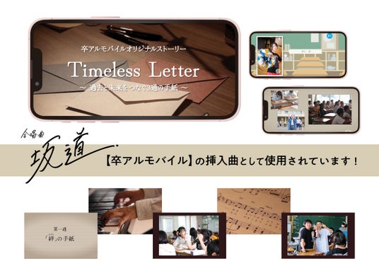 学校生活の思い出を、写真や動画で綴るストーリー仕立ての展開が特徴で、オリジナルストーリー【Timeless Letter ~過去と未来をつなぐ3通の手紙~】の挿入曲として合唱曲『坂道』が使用されています。