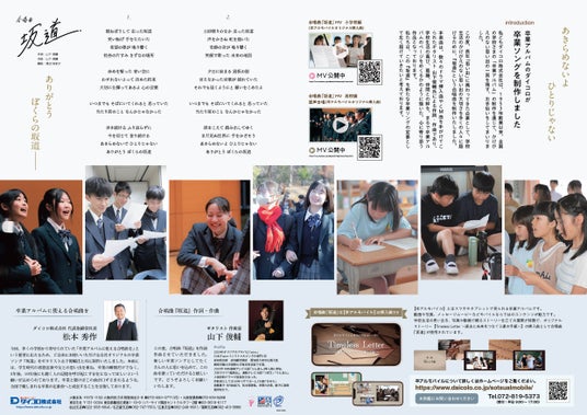 今回、多くの学校から寄せられていた「卒業アルバムに使える合唱曲を」という要望に応えるため、ご自由にお使いいただける自社オリジナルの卒業 ソング『坂道』をギタリスト・作曲家 山下俊輔氏と共に制作いたしました。本曲には、学生時代の喜怒哀楽や友との思い出を重ね、卒業の瞬間だけでなく、 5年後、10年後にも聴く人の記憶を呼び起こす存在になってほしいという願いが込められております。卒業と聞けばこの曲が口ずさまれるような、全国で親しまれる卒業の定番曲へと成長することを目指しております。