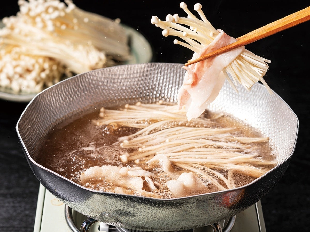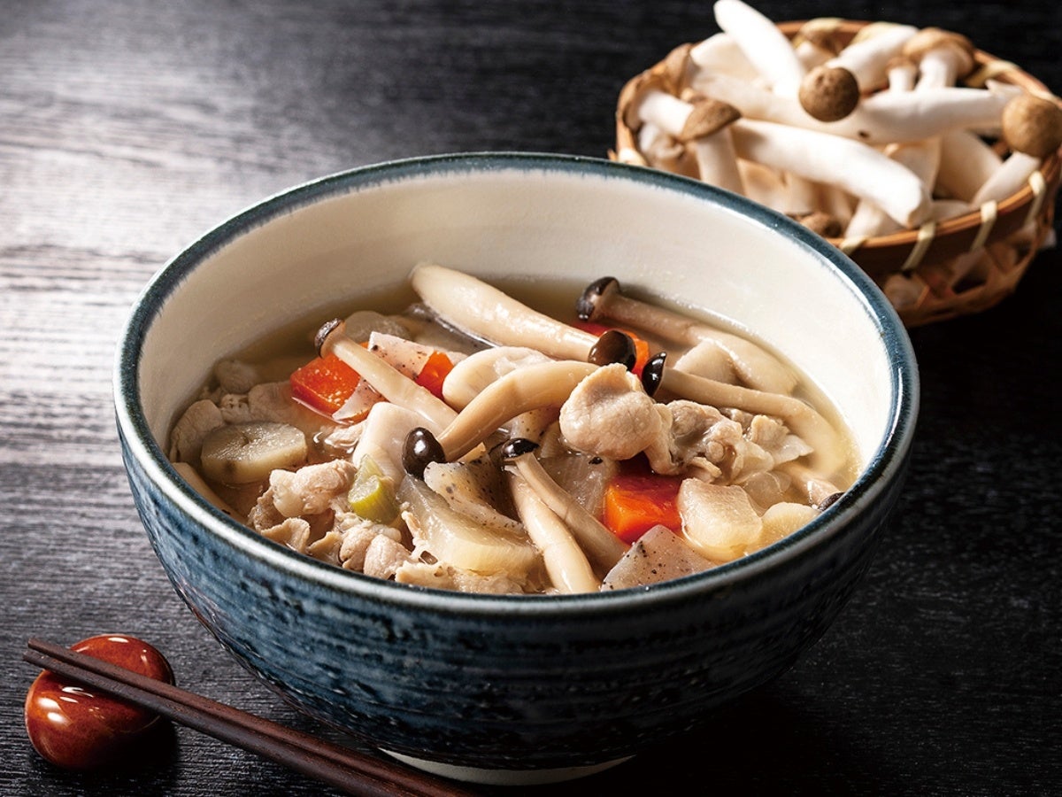 長野県産の豊かな土壌で育った、香り高く食感の良い「ぶなしめじ」をたっぷりと。優しいお出汁と豚肉の甘みが、しめじの旨味をさらに引き立てます。