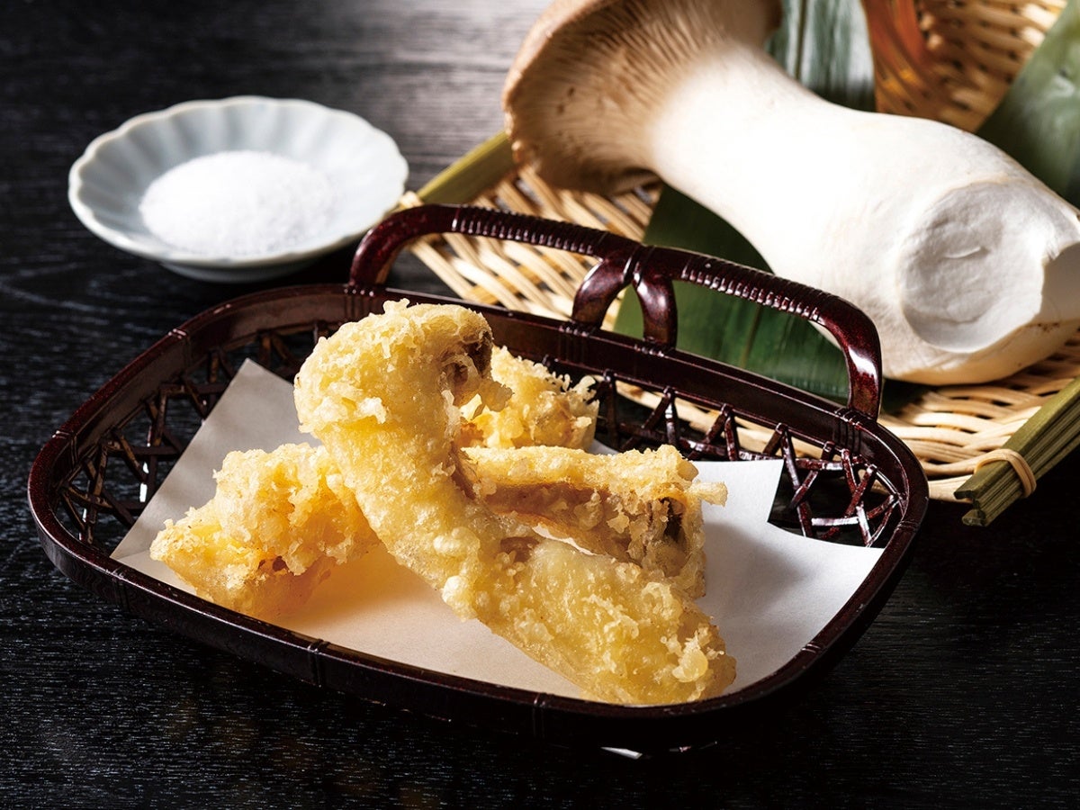 長野県産の立派なエリンギを、天婦羅に仕立てました。 高温の油で揚げることでエリンギの持つ水分と旨味をギュッと閉じ込めています。軽やかな衣のあとにやってくる、驚くほど力強い弾力。 噛みしめるたびに溢れ出す瑞々しい香りは、鮮度抜群の長野県産ならではの醍醐味です。