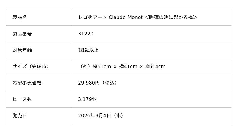レゴジャパン株式会社(代表取締役社長:マイケル・エベスン/所在地:東京都港区、以下レゴジャパン)は、大人の『好き』や『情熱』をクリエイティブに自分で表現できる大人向けのレゴ(R)ブロックから、ニューヨークにあるメトロポリタン美術館とのコラボレーションによる「レゴ(R)アート Claude Monet <睡蓮の池に架かる橋>」を2026年3月4日(水)より販売開始します。