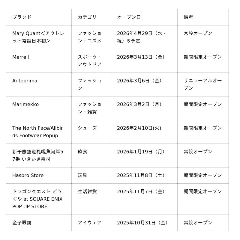 当施設では2025年10月からこれまでかけても、大阪初上陸の回転寿司「新千歳空港 札幌魚河岸57番 いきいき寿司」や、お子様・ファミリー向けの玩具やゲームを取り扱う「Hasbro Store」、高品質な国産アイウェアブランド「金子眼鏡」など幅広いジャンルの新店舗が続々とオープンしており、より充実したショッピングをお楽しみいただけます。