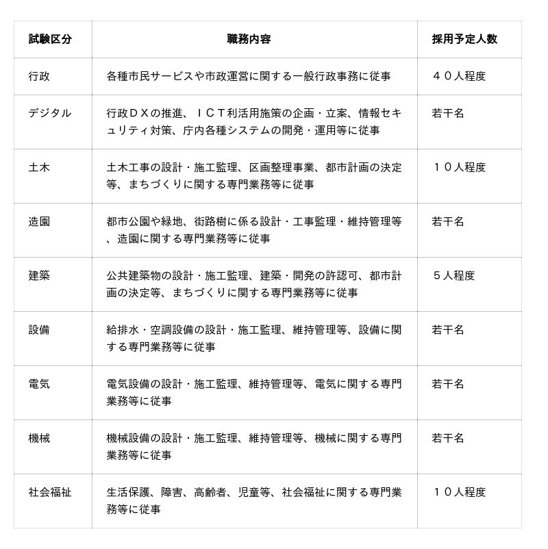 対象職種は9職種(行政・デジタル・土木・造園・建築・設備・電気・機械・社会福祉)で、SPI3(テストセンター方式)の導入により特別な公務員試験対策は不要です。
