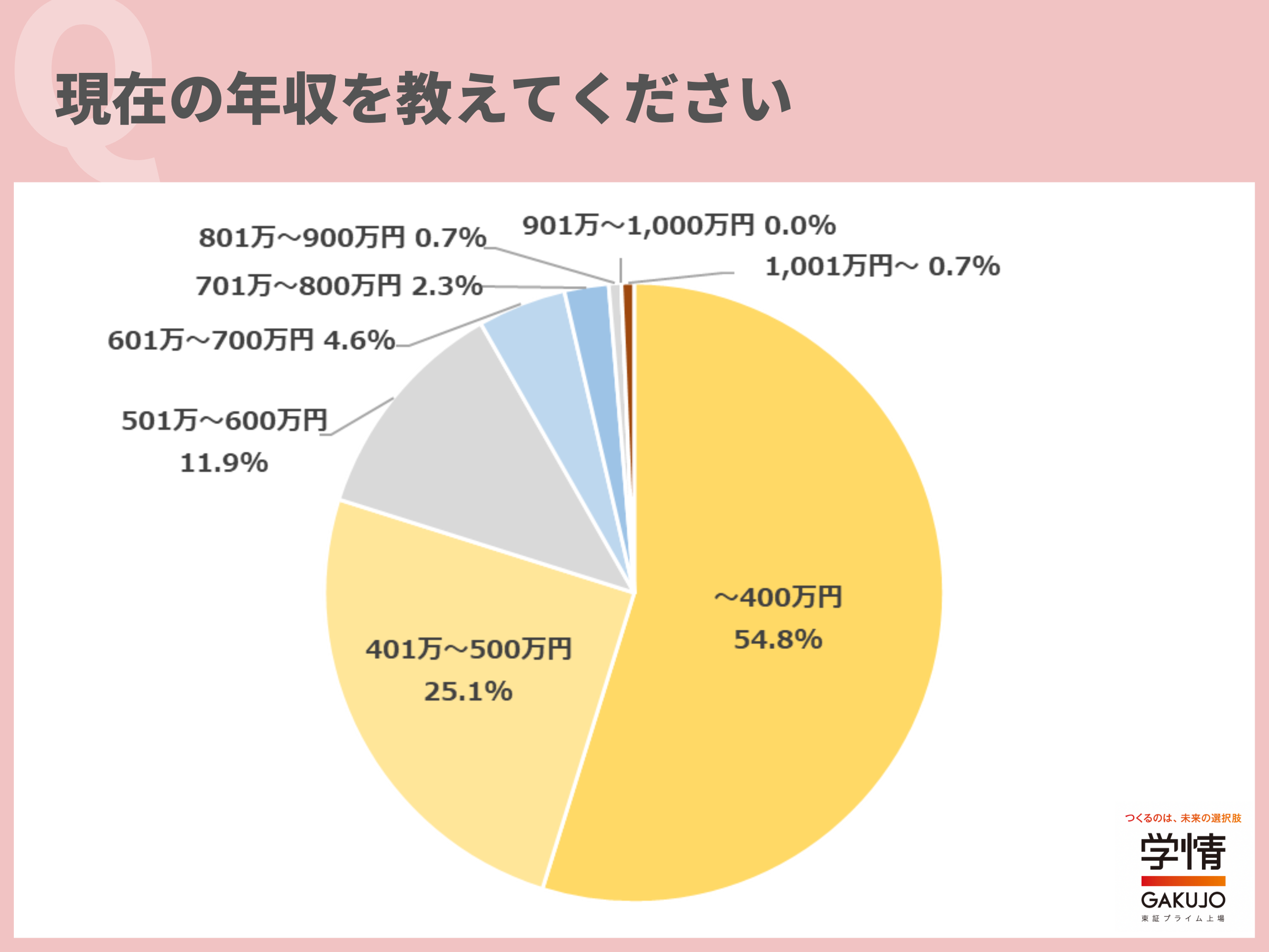 20代後半から30代の転職希望者の現在の年収は、「400万円以下」が54.8%と過半数を占め、次いで「401万~500万円」25.1%、「501万~600万円」11.9%が続きました。「401万円以上」の合計は45.3%で、400万円以下と401万円以上がほぼ半々でした。