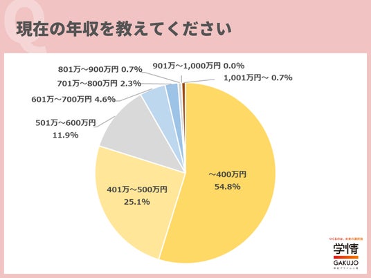 株式会社学情(本社:東京都中央区)は、20代後半から30代の転職観をひも解くため、この年代の転職希望者を対象にインターネットアンケートを実施しました。自分のスキルや実績に対して現在の給与やポジションは見合っているかを尋ねると、「見合っていない」との回答が6割を超え、多くが給与やポジションに不満を抱いていることが分かります。現在の年収は「400万円以下」が54.8%、「401万円以上」の合計は45.3%で、400万円以下と401万円以上がほぼ半々。転職先での希望年収は「500万円以下」の合計53.4%、「501万円以上」の合計46.6%で、500万円以下と501万円以上がほぼ半々という結果でした。現在の年収の数字と比べると、おおむね「年収100万円アップ」を目指す人が多いという傾向が見てとれます。