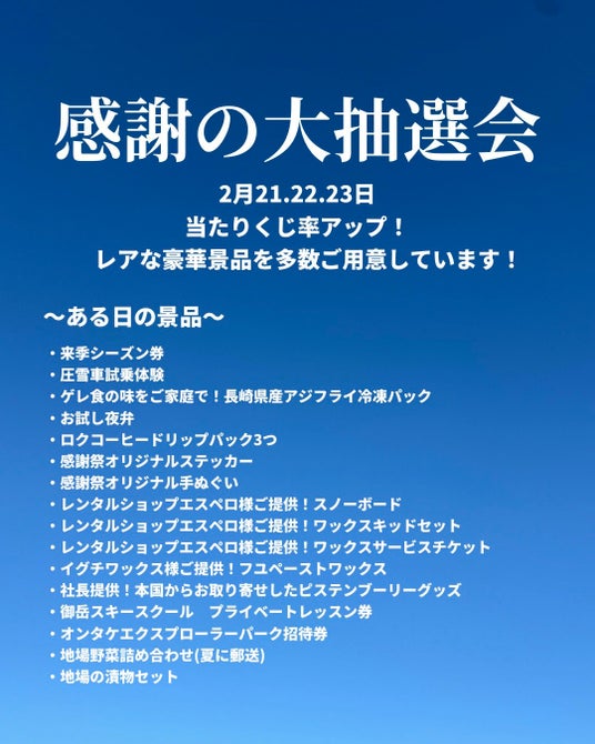 日頃よりご来場いただいている皆さまへの感謝の気持ちを込め、期間中は大感謝価格の他、毎日楽しめる抽選会や餅まきに加え、スキー・スノーボード愛好者からファミリーまで楽しめる特別イベントを多数ご用意しています。