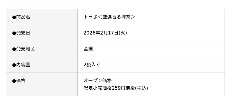 株式会社ロッテ(東京都新宿区、代表取締役社長執行役員:中島英樹、以下ロッテ)は、「トッポ<厳選香る抹茶>」を2月17日(火)より発売します。本商品は、トッポの抹茶フレーバーとして約3年ぶりの発売となります。過去に発売した抹茶フレーバーもご好評をいただいており、待望の復活となります。最高段位茶師が厳選した京都宇治抹茶を使用し、香ばしいヘーゼルナッツを練り込んだ特製プレッツェルに、京都宇治抹茶のやさしく深い香りが広がるチョコレートをたっぷりと閉じ込めました。
