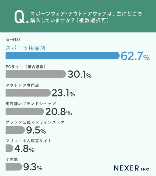 もっとも多かったのは「スポーツ用品店」で62.7%でした。次いで「ECサイト(総合通販)」が30.1%、「アウトドア専門店」が23.1%という結果です。