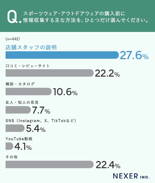 質問4:スポーツウェア・アウトドアウェアの購入前に情報収集する主な方法を、ひとつだけ選んでください。