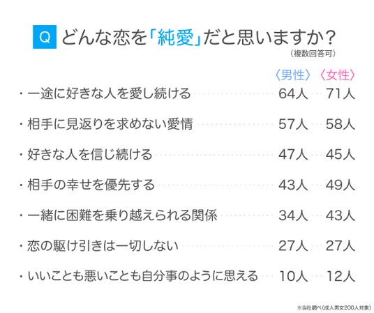 「どのような恋を純愛だと思うか」を尋ねたところ、以下の項目が上位に挙がりました。