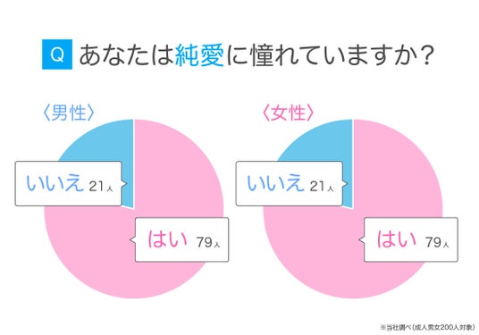 「純愛に憧れているか」を尋ねたところ、男女ともに約8割が「はい」と回答しました。