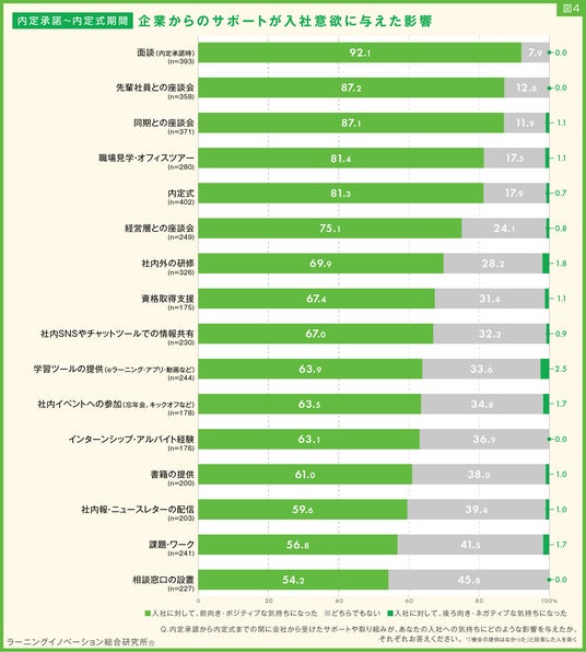 一方、「相談窓口の設置」や「課題・ワーク」は、約半数は入社に対して前向きになったものの、約4割は「どちらでもない」と回答する結果となりました(図4)。