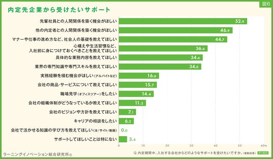 6. 内定期間中、内定先企業に求めるサポート1位「先輩と人間関係を築く機会」、半数以上が回答