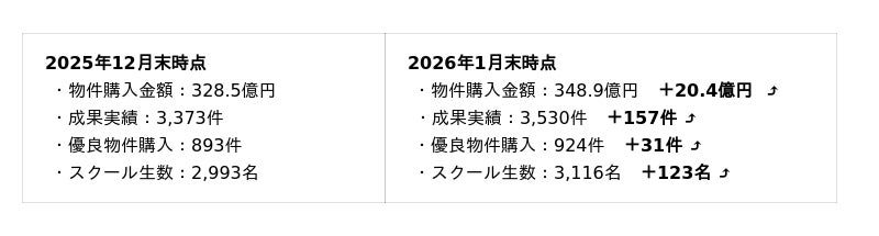 さくらいふ株式会社が運営する不動産投資スクール「神・大家さん倶楽部」は、2026年1月末時点で累計スクール生数が3,116名となり、3,000名を突破したことをお知らせいたします。