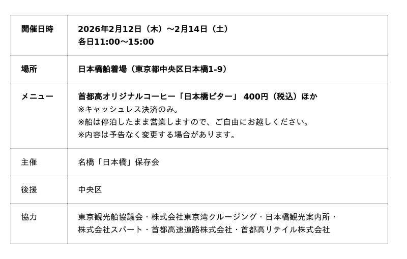 2026年2月12日(木)~14日(土)の3日間、日本橋船着場を活用して初の特設カフェが期間限定でオープンします。名橋「日本橋」保存会(東京都中央区 会長 中村胤夫)が主催し、首都高速道路株式会社の協力のもと、船上では首都高オリジナルコーヒー「日本橋ビター」や甘酒、日本橋にゆかりのあるスイーツがいただけます。