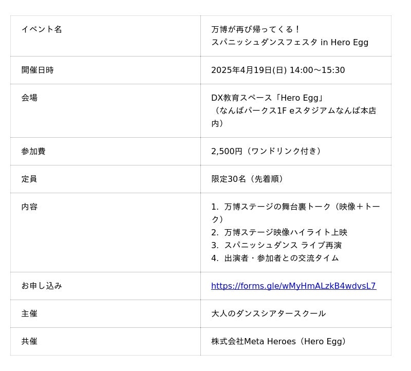 株式会社Meta Heroes(本社所在地:大阪府大阪市、代表取締役:松石和俊、以下「当社」)は、当社が運営するDX教育施設「Hero Egg(ヒーローエッグ)」において、2025年4月19日(日)、大阪・関西万博のアリーナ会場で実施された「スパニッシュダンスフェスタ」の再演イベントを共催いたします。