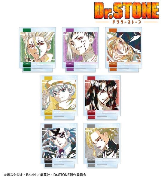 石神千空、あさぎりゲン、七海龍水、西園寺羽京、獅子王司、Dr.ゼノ、スタンリー・スナイダーのイラストを新たなタッチで魅力的に表現し、アクリルスタンドに仕上げました。