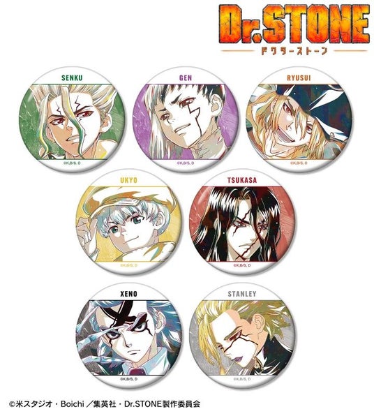 石神千空、あさぎりゲン、七海龍水、西園寺羽京、獅子王司、Dr.ゼノ、スタンリー・スナイダーのイラストを新たなタッチで魅力的に表現し、缶バッジに仕上げました。