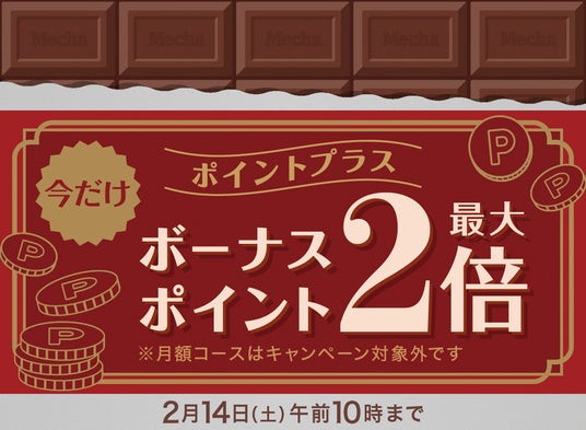 期間内に対象のポイントプラスコースにてポイントをご購入いただいた場合、最大で通常の2倍のボーナスポイントをプレゼントするキャンペーンを開催いたします。本キャンペーンは、必要なときに必要な分だけポイントをご購入いただける「ポイントプラス」にて実施いたします。ご購入コースにより異なりますが、期間中は最大で通常の2倍のボーナスポイントをプレゼントいたします。