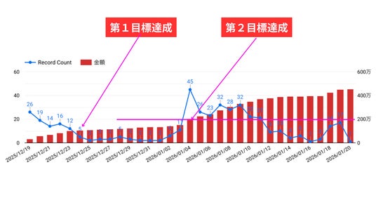 プロジェクト序盤は開始5日目に第1目標の100万円を達成しました。